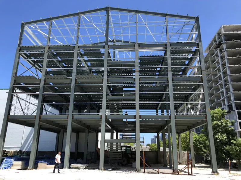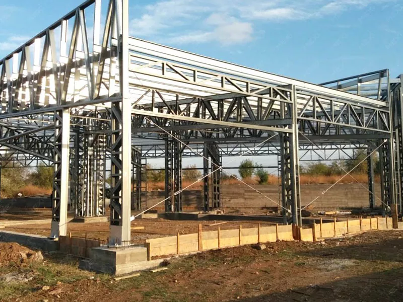 4. Ferro Structure instruitur The prefabricata chalybea portantur ad situm constructionem et convenerunt utentes grues et alia instrumenta gravia. Processus institutionis incipit erigere et ancorare columnas ad fundamentum, deinde insertis trabibus ad fabricam horrei fabricandam. Tectum trusses tunc sunt muniti ad texit ratio.